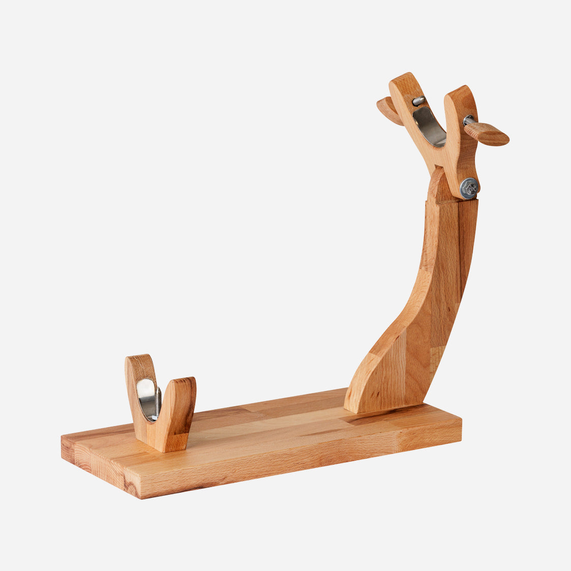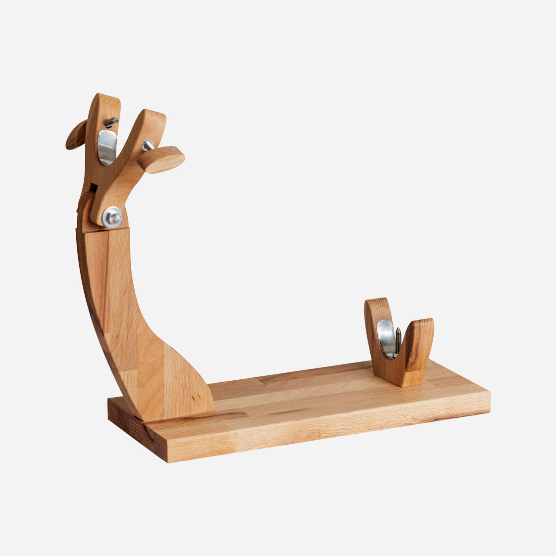 Stalak za pršutu od bukovog drveta i gvozdenih elemenata, sa prohromskim šiljkom izrađen je od kombinacije prirodne bukovine i čvrstog gvožđa. Prohromski šiljak obezbeđuje stabilno pričvršćivanje pršute, dok jednostavna konstrukcija omogućava praktičnu i pouzdanu upotrebu. Namenjen je onima koji traže osnovni, funkcionalan stalak za sečenje pršute.